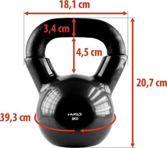 Kettlebell HMS 8 kg je spolehlivá volba pro začátečníky i pokročilé. Pevné litinové tělo pokryté vinylem chrání podlahu, snižuje hluk a dobře se udržuje. Ergonomický, široký úchop umožňuje bezpečné držení jednou i oběma rukama, zatímco ploché dno zajišťuje stabilitu při odkládání a přípravě na další sérii.