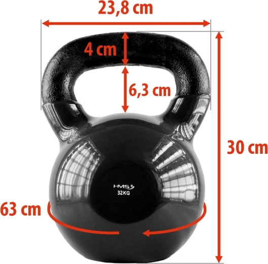 Kettlebell HMS 32 kg je robustní činka ve tvaru zvonu z kvalitní oceli s vinylovým potahem, který tlumí nárazy a chrání podlahu. Široké zakřivené madlo nabízí jistý úchop pro jednoruční i obouruční cvičení. Stabilní ploché dno zajišťuje bezpečné odložení a lepší kontrolu při technických cvicích.