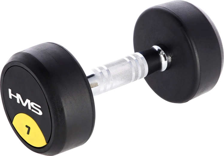 HMS HG Pro 7 kg je kvalitní pogumovaná jednoručka pro silový trénink, vhodná do domácí posilovny i komerčních fitness center. Litinové jádro potažené silnou vrstvou gumy zvyšuje odolnost, snižuje hluk a chrání podlahu. Ergonomicky tvarovaná, chromovaná ocelová rukojeť se vroubkováním zajišťuje jistý a pohodlný úchop při cvicích jako jsou bicepové zdvihy, tlaky nad hlavu či upažování.