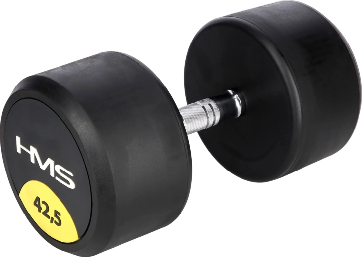 HMS HG Pro 42,5 kg je robustní jednoruční činka navržená pro intenzivní použití. Litinová hlava s tlustou vrstvou gumy tlumí nárazy a hluk, chrání povrchy a prodlužuje životnost vybavení. Čelní strana je přehledně označena logem HMS a hmotností.