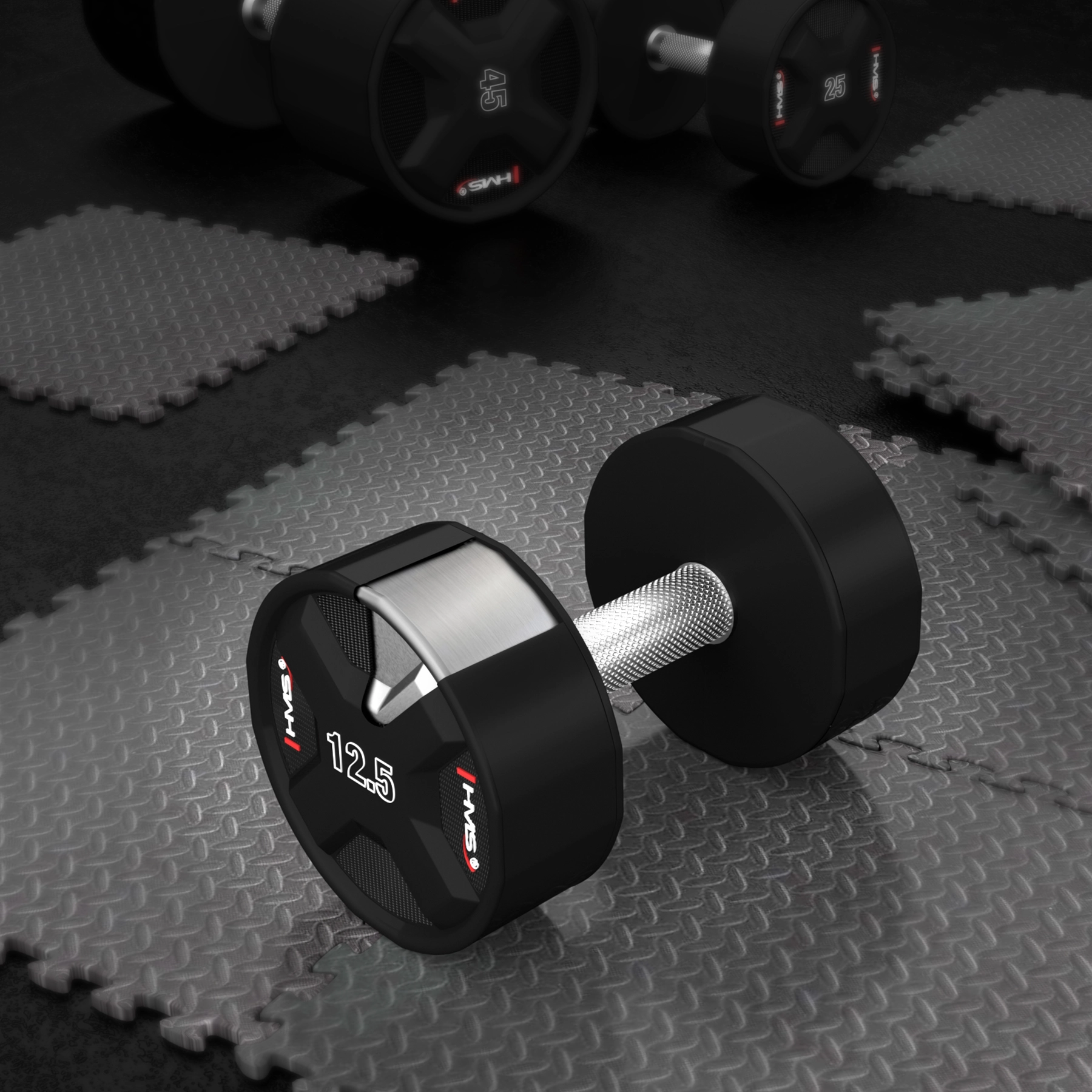 Jednoruční činka HMS 12,5 kg je navržena pro náročné uživatele, kteří vyžadují spolehlivost a stabilní výkon v každém opakování. Polyuretanové (CPU) konce chrání činku před nárazy, nepoškozují podlahu a zachovávají elegantní vzhled i při častém používání.