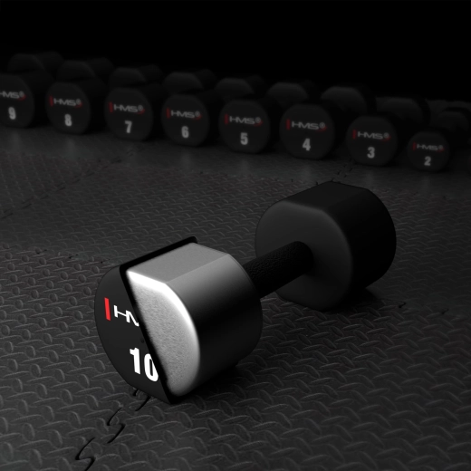 Jednoruční činky HMS HPT spojují masivní ocelové jádro s povrchem z termoplastického polyuretanu (TPU), který je pružný, odolný vůči nárazům a bez zápachu. Díky tomu tlumí hluk, chrání podlahu a zachovávají si čistý vzhled i při intenzivním používání. Jasné označení hmotnosti urychluje výběr správné zátěže.