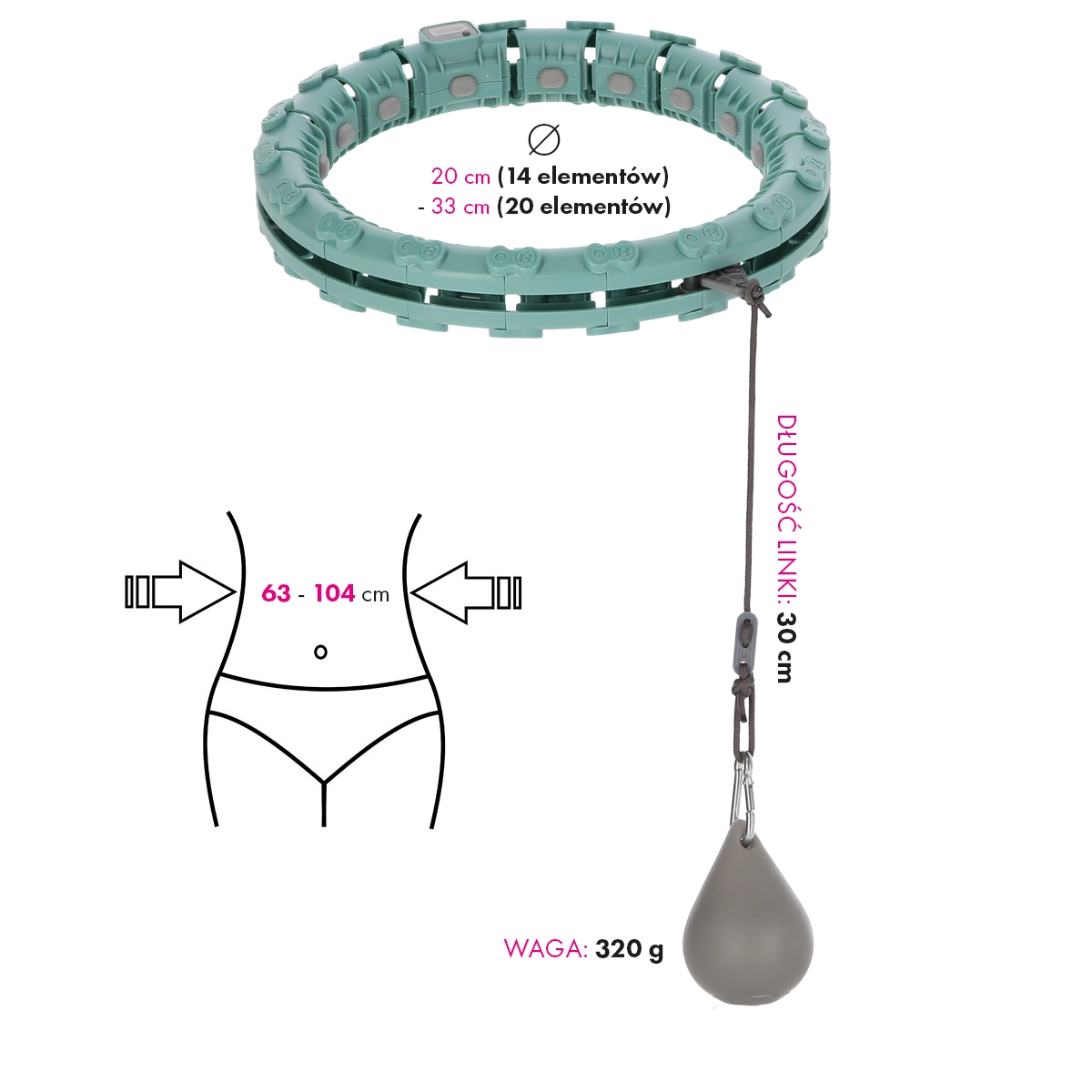 Chytrá masážní obruč je navržena pro pohodlné a efektivní spalování kalorií v domácích podmínkách. Segmentová konstrukce z 20 dílů umožňuje přesné přizpůsobení obvodu pasu 63–104 cm, takže obruč zůstává na místě a nepadá přes boky. Vnitřní masážní výstupky tlumí vibrace a zároveň příjemně masírují střed těla.