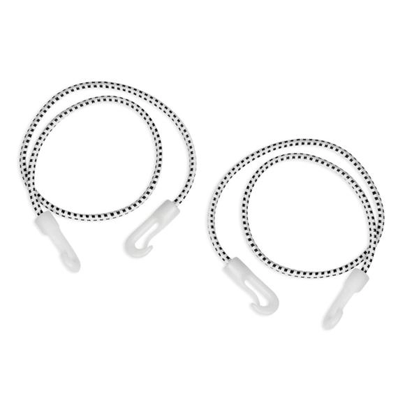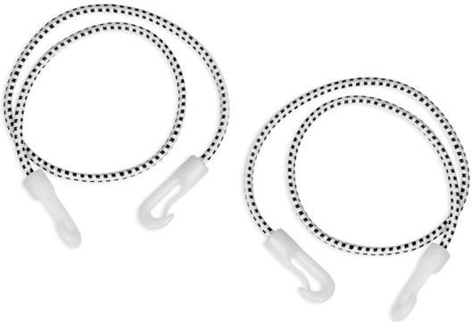 Dvě montážní gumy s karabinami z tvrzeného plastu pro rychlé ukotvení mezi podlahu a strop v místnostech vysokých 180–300 cm.