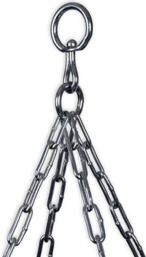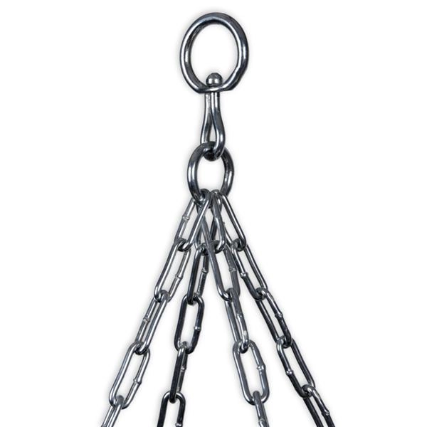 Svařované řetězy a otočné závěsné oko udrží pytel stabilní a brání překroucení při kombinacích úderů a kopů.