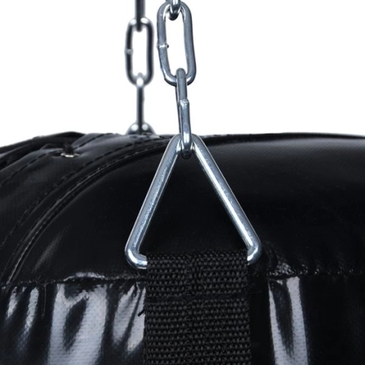 Bezpečné a stabilní zavěšení zajišťují odolné svařované řetězy a otočné závěsné oko, které zabraňuje kroucení. Trojúhelníková montážní oka chrání popruhy proti poškození, a díky šněrovacímu hornímu otvoru je doplňování nebo úprava výplně rychlá a jednoduchá. Doporučená výška místnosti pro optimální zavěšení je cca 215 cm.