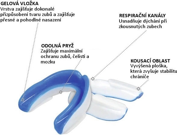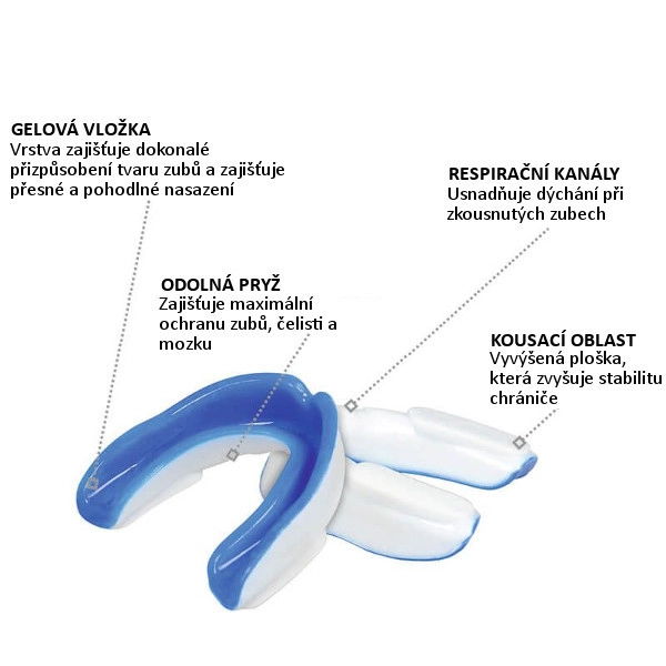 Univerzální chránič zubů pro kontaktní sporty s dvouvrstvou konstrukcí pro maximální bezpečnost a pohodlí. Vnitřní gelová vrstva zajišťuje komfortní usazení, zatímco vnější tvrzená guma s vzduchovými kanálky pro snadné dýchání a stabilizačními ploškami drží chránič pevně při skusu.