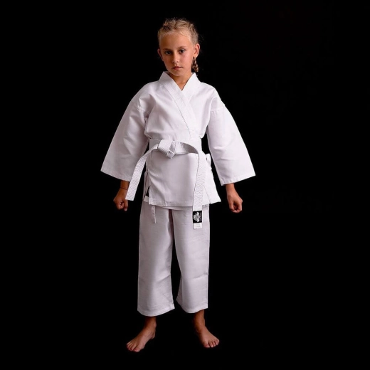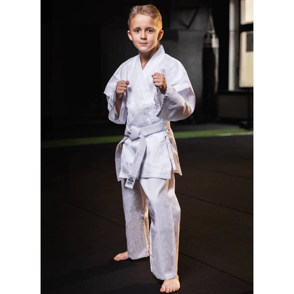 Praktický střih s zesílením v rozkroku a na okrajích kabátu zvyšuje odolnost při pravidelném tréninku. Kalhoty mají dvojité upevnění – gumu a šňůrku, takže nesjíždějí a drží na místě i během dynamických kombinací. Součástí sady je bílý pás, který dětem umožní okamžitě vyrazit na trénink.