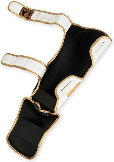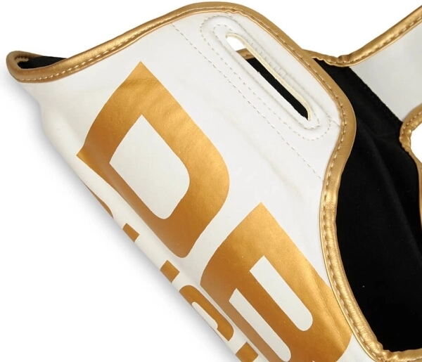 Bezpečné uchycení zajišťují široké a pevné pásky se snadným zapínáním. Povrch v elegantní bílo‑zlaté kombinaci doplňuje kvalitní šití pro dlouhou životnost. Vhodné pro kickbox, MUAY THAI, MMA i další kontaktní sporty – pro trénink technik i sparing.