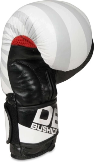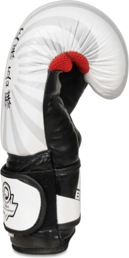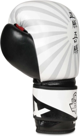 Široká manžeta se suchým zipem stabilizuje zápěstí a snižuje riziko zranění, zatímco palec je bezpečně spojen řemínkem se zbytkem rukavice. Design „Japan“ vyniká bílým základem se šedými paprsky a nápisem v kandži – styl, který zaujme v ringu i v tělocvičně. Každý pár je ručně šitý a testovaný ve spolupráci s trenéry boxu podle bezpečnostních norem, aby splnil nároky pravidelného a intenzivního tréninku.