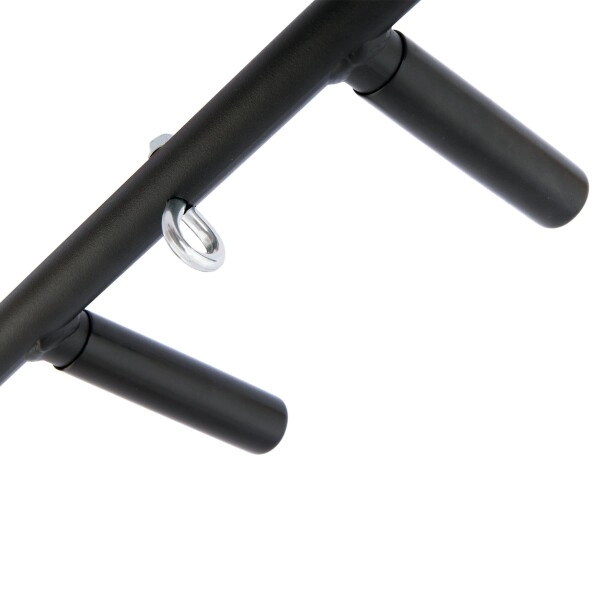 Masivní ocelový rám s práškovou povrchovou úpravou odolává opotřebení a gumové rukojeti poskytují jistý a komfortní úchop. Praktické centrální oko rozšiřuje využití hrazdy – zavěsíte na něj například boxovací pytel, odporové gumy či TRX popruhy.