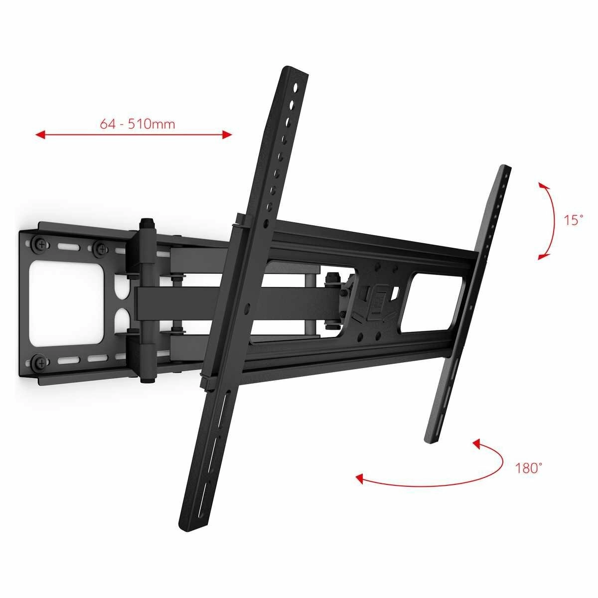Robustní konstrukce s nosností 60 kg je vhodná pro velké obrazovky od 32 do 84″ a podporuje standardy VESA 200×200 až 600×400. Držák lze přisunout ke stěně na 64 mm pro čistý vzhled, nebo vysunout až na 510 mm pro snadné natočení.