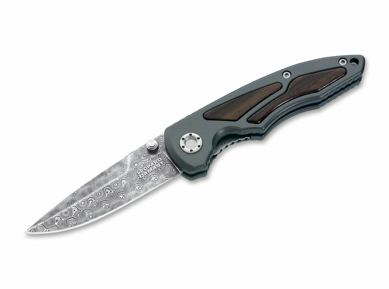 Exkluzivní sběratelský kapesní nůž BÖKER MANUFAKTUR SOLINGEN Leopard-Damast I s 300vrstvou damaškovou čepelí kovanou z oceli tanku Leopard I. Nabízí manuální otevření palcovými kolíky, spolehlivou pojistku Linerlock a prémiovou rukojeť z eloxovaného hliníku s dřevěnými vložkami Ziricote. Součástí je dárková krabička, certifikát pravosti a individuální sériové číslo.