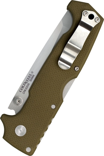 Robustní kapesní nůž Cold Steel SR1 Tanto pro náročné použití a každodenní nošení (EDC). Nabízí tanto čepel z prémiové oceli CPM-S5VN, mimořádně pevnou pojistku Tri-Ad Lock a protiskluzovou rukojeť G10 v zelené barvě se sponou na kapsu/opasek.