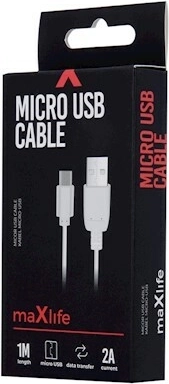 Univerzální bílý kabel Maxlife s konektorem micro USB pro rychlé a stabilní nabíjení i přenos dat. Podporuje rychlé nabíjení 2 A, má délku 1 m pro pohodlné použití a díky flexibilní konstrukci je odolný a snadno se používá se smartphony, powerbankami, sluchátky i reproduktory.