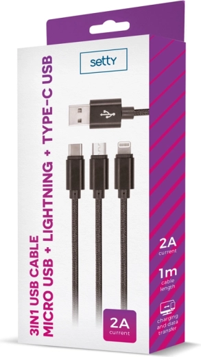 Hledáte jeden kabel pro všechna zařízení? SETTY 3v1 nylonový USB kabel v černé barvě nabízí praktické řešení s konektory microUSB, Lightning a USB‑C. Díky odolnému nylonovému opletení je kabel robustní, méně se zamotává a lépe odolává každodennímu používání.