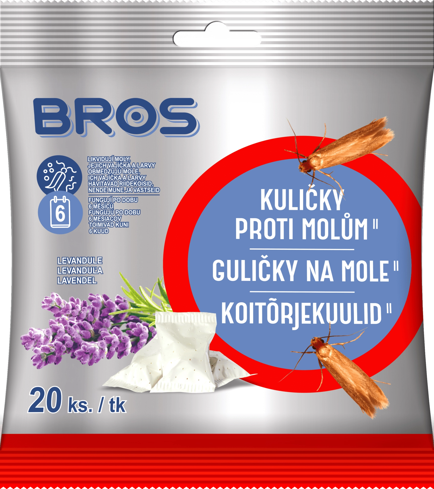 Udržte svou skříň svěží a bez molů. Osvědčené kuličky BROS s vůní levandule účinně odpuzují šatní moly a zároveň provoní uložené prádlo. Díky dlouhodobému účinku až 6 měsíců představují nenáročné a ekonomické řešení ochrany textilií.