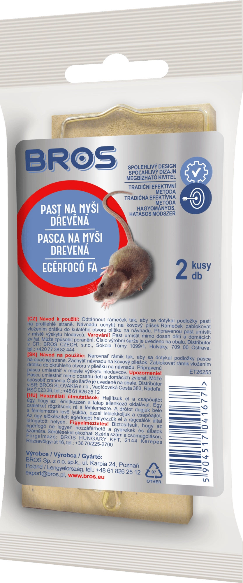 Dřevěná past na myši BROS je klasické a osvědčené řešení pro rychlé odstranění nežádoucích hlodavců. Vyrobena z bukového dřeva s vyšší odolností vůči vlhkosti, poskytuje stabilitu, dlouhou životnost a spolehlivý zásah. Díky jednoduché konstrukci ji snadno nastražíte doma, v garáži, sklepě i na chalupě.
