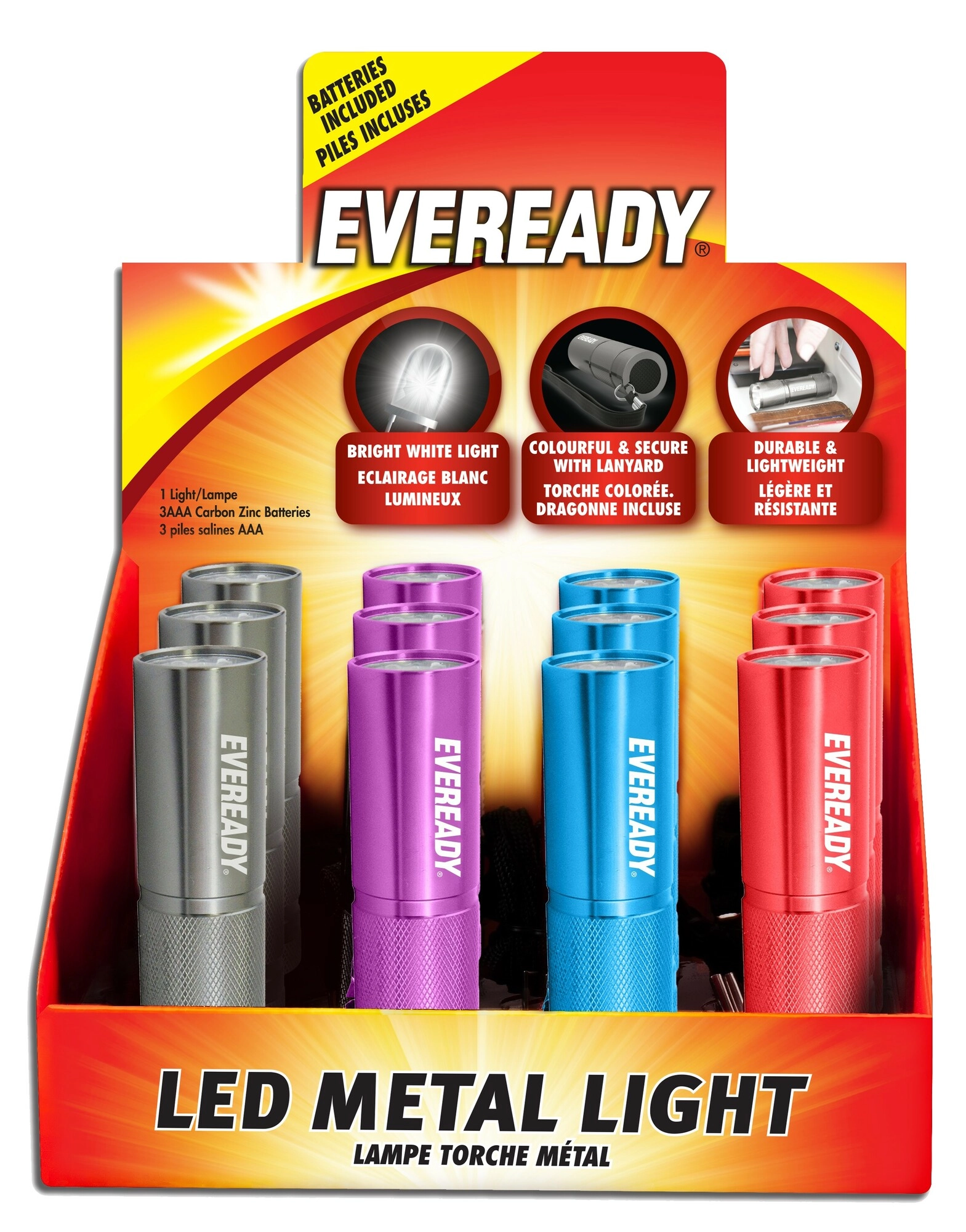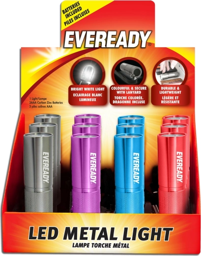 Kompaktní kapesní svítilna ENERGIZER Eveready Metal je ideální na klíče i do kapsy. Nabízí kovové tělo pro vyšší odolnost, napájení 3× AAA pro snadnou výměnu a prodej po 1 ks v různých barvách (černá, purpurová, tyrkysová, červená).