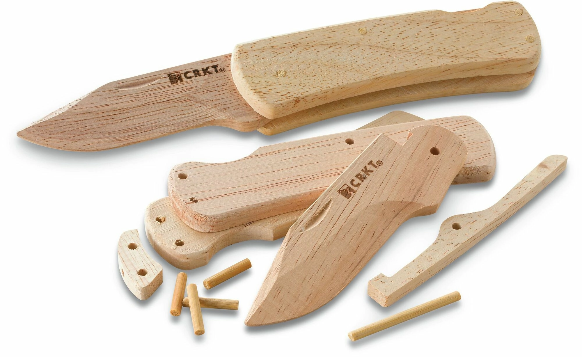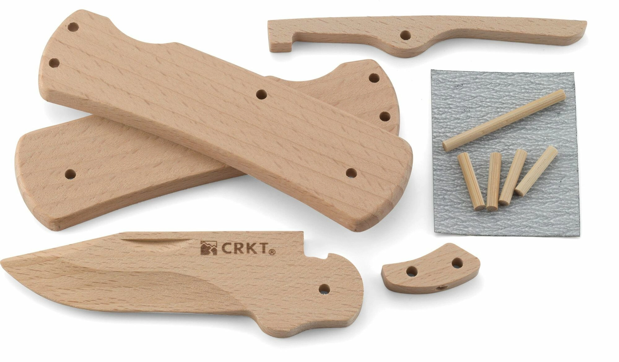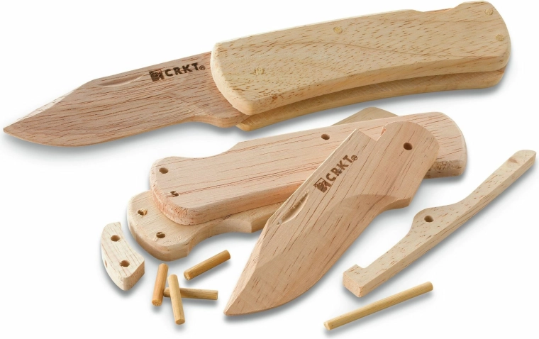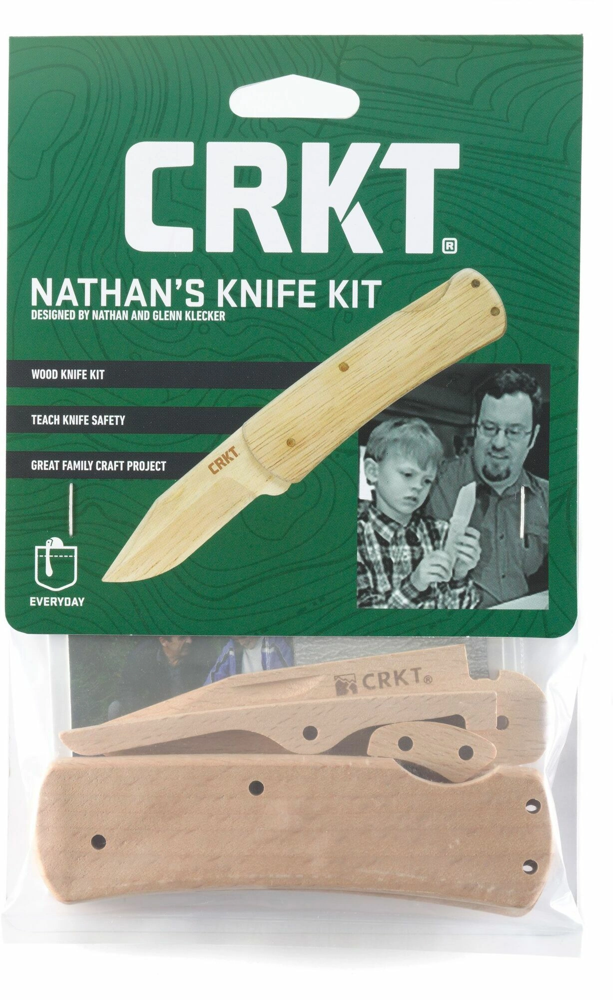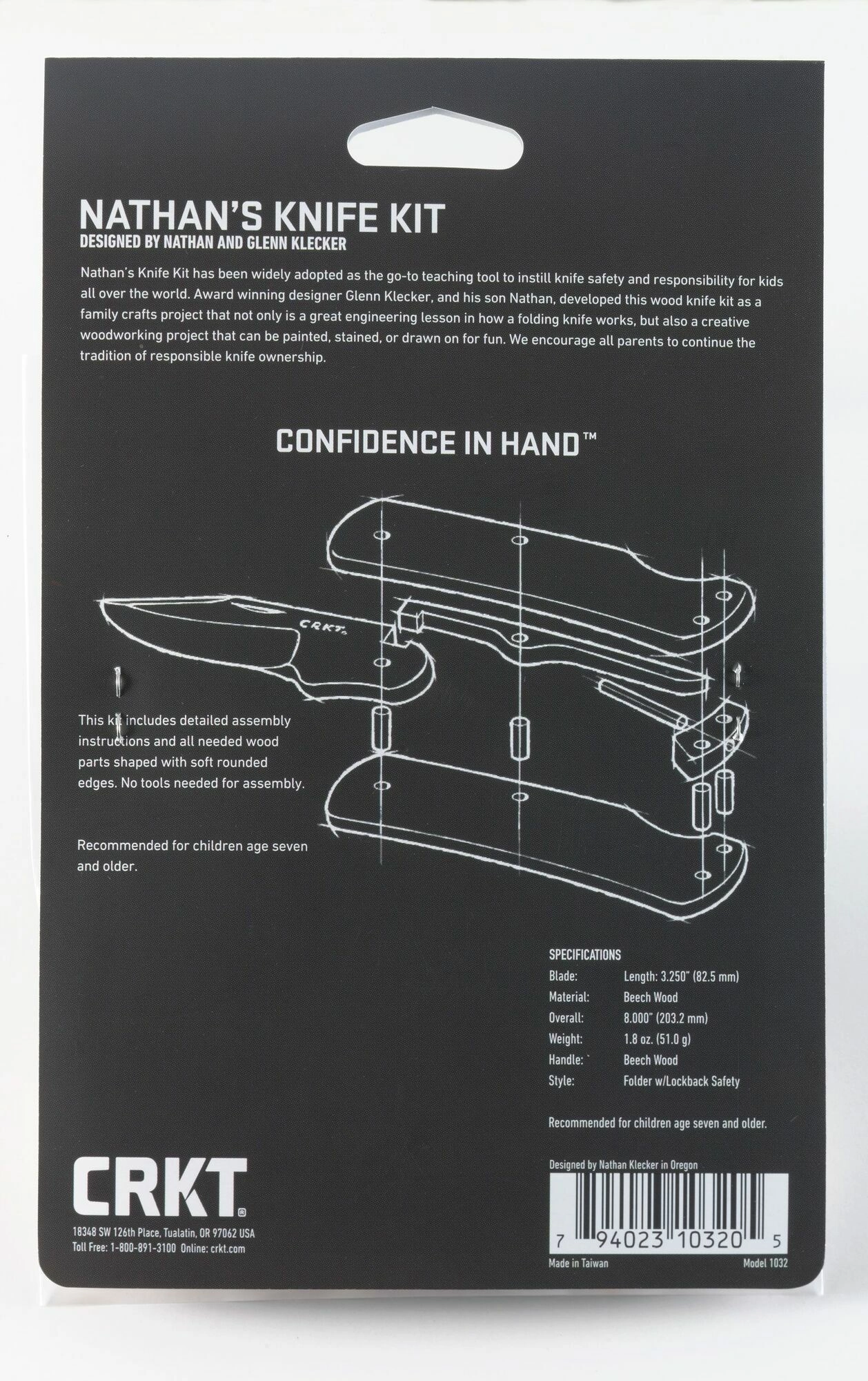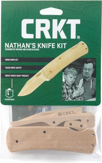 Učte se principy zavíracích nožů bezpečně a hravě. Stavebnice CRKT Nathan's Knife Kit, inspirovaná nápadem sedmiletého Nathana Kleckera, obsahuje předpřipravené díly s předvrtanými otvory a vše potřebné k montáži. Sestavení je snadné, nevyžaduje nástroje a výsledkem je plně funkční model dřevěného kapesního nože.