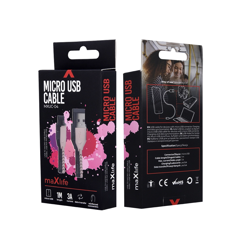 Hledáte praktický a odolný kabel pro zařízení s microUSB? Tento růžový Maxlife kabel nabízí rychlý přenos dat a efektivní nabíjení s podporou proudu až 3 A. Díky nylonovému opletu je kabel odolný vůči zlomení a zamotávání, zatímco zesílené konektory chrání před vylomením.