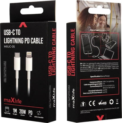 Hledáte spolehlivý kabel pro své zařízení s konektorem Lightning? Maxlife USB‑C – Lightning v elegantní bílé barvě přináší rychlé nabíjení Power Delivery 20 W a stabilní synchronizaci dat. Díky délce 1 metr pohodlně dosáhne od nabíječky k telefonu, ať už jste u stolu nebo na cestách.