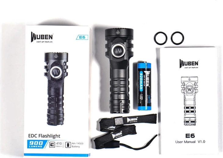 Svítilna WUBEN E6 je stvořena pro každodenní nošení i náročnější použití v terénu. Tělo z eloxovaného hliníku (typ III) odolá pádům z výšky až 1,5 m a krytí IP68 zaručuje úplnou prachotěsnost a odolnost vůči ponoření do vody do hloubky 2 m po dobu 60 minut. Protiskluzová textura zajišťuje jistý úchop i v rukavicích.