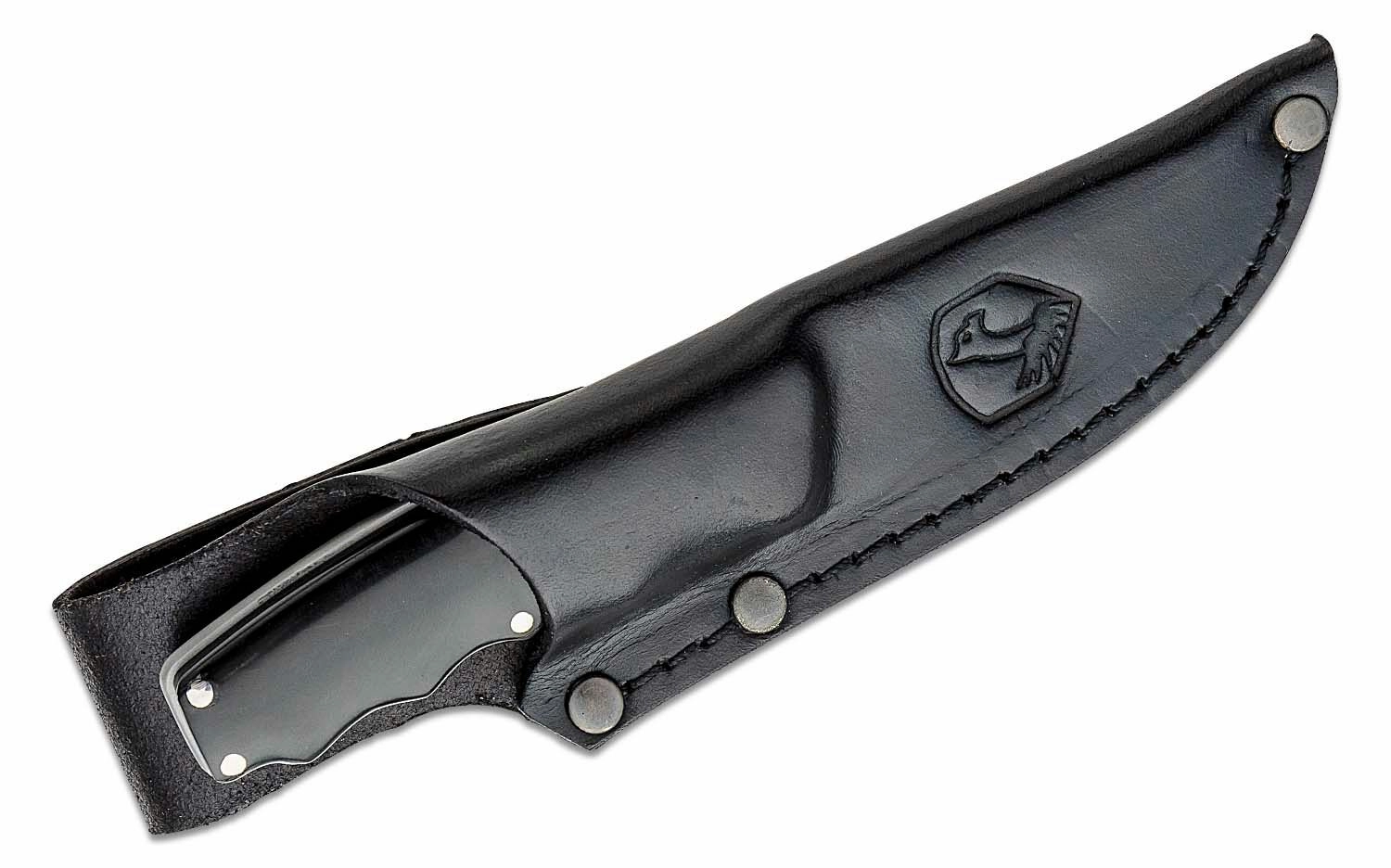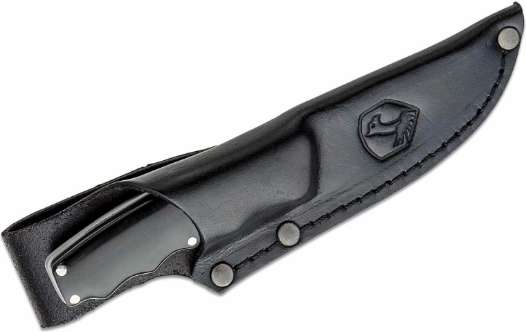 Rukojeť z odolného kompozitu G10 v černé barvě nabízí jistý a pohodlný úchop i v rukavicích nebo za mokra. Součástí balení je kvalitní kožené pouzdro pro bezpečné a stylové nošení na opasku.