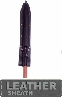 Dřevěná rukojeť ze tvrdého tropického dřeva je hladce opracovaná pro jistý a pohodlný úchop. Součástí je ručně šité kožené pouzdro, které usnadňuje bezpečné přenášení i uložení nástroje v táboře či dílně.