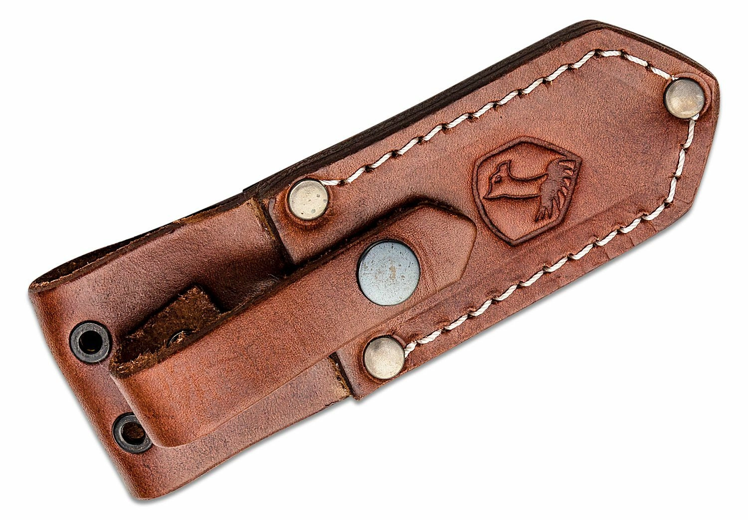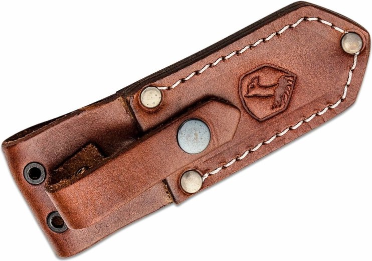 Rukojeť z hnědé Micarty je tvarovaná pro jistý úchop a její zdrsněný povrch drží i v náročných podmínkách. Dýka se dodává s kvalitním koženým pouzdrem, které umožňuje bezpečné a pohodlné nošení při každodenním používání.