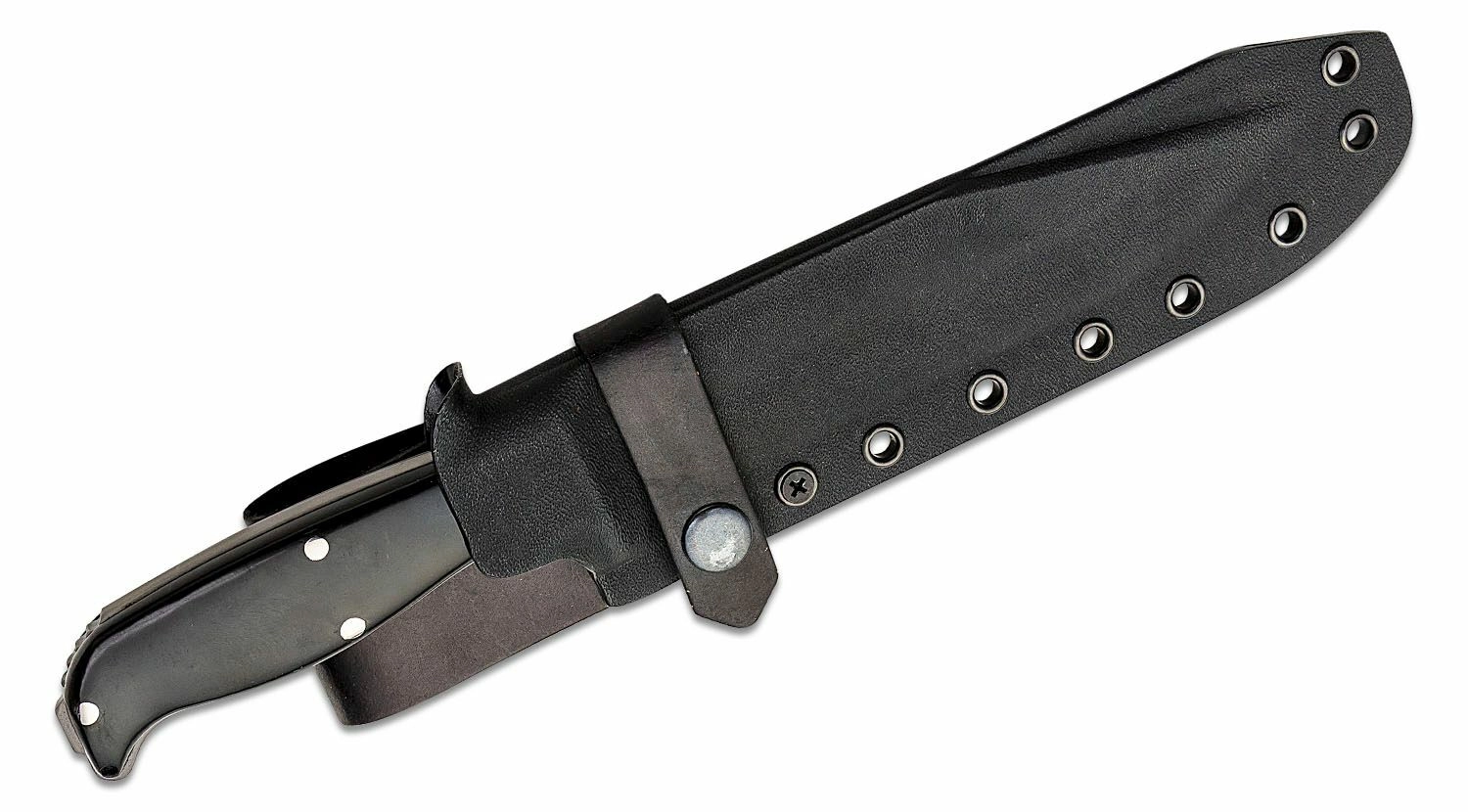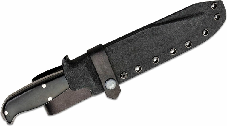 Černá rukojeť z Micarty nabízí bezpečný a pohodlný úchop i v mokru či v rukavicích. Integrovaná úderná patka na konci rukojeti poslouží jako nouzové kladívko. Nůž se dodává s pevným pouzdrem Kydex s koženým poutkem pro více možností nošení.