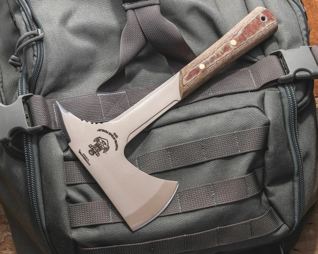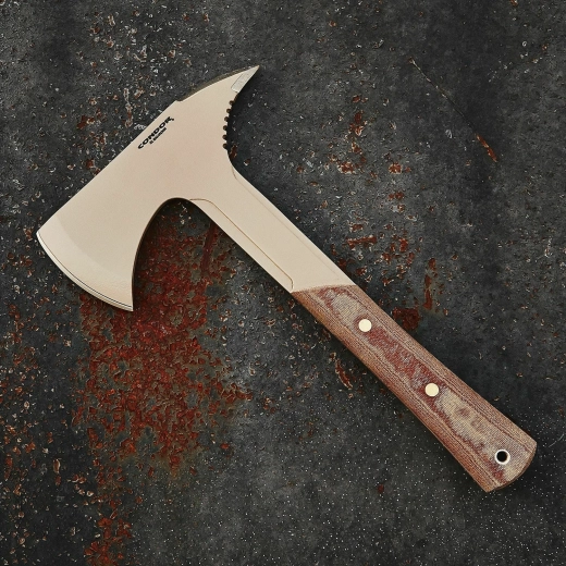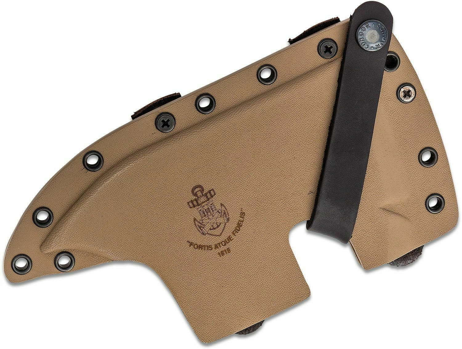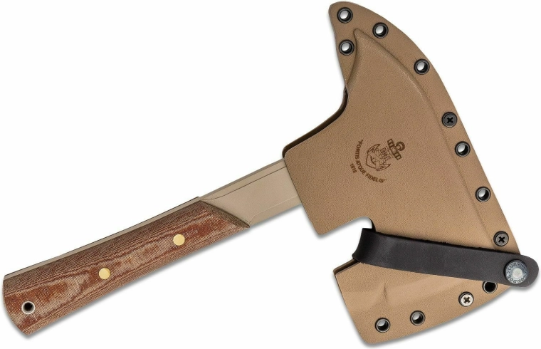 Rukojeť z hnědé Micarty nabízí jistý úchop v jakémkoli počasí, na konci je otvor pro šňůru pro jištění nebo zavěšení. Sekera je dodávána s pevným pouzdrem Kydex s pútkem/úchyty pro bezpečné nošení a rychlý přístup.