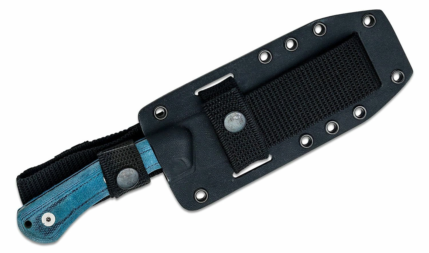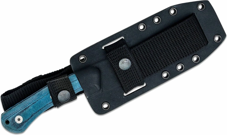Rukojeť z modré Micarty s texturovaným povrchem zajišťuje bezpečný a pohodlný úchop i v mokru. Očko na šňůru umožňuje jistící uchycení. Součástí je odolné pouzdro Kydex kompatibilní se systémem MOLLE pro flexibilní nošení na výstroji či opasku.