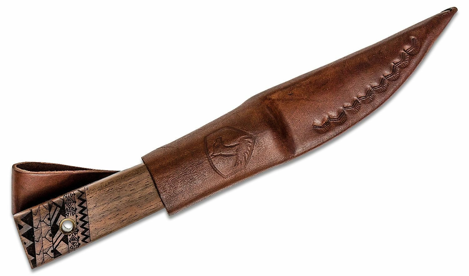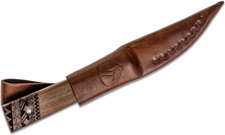 Rukojeť z ořechového dřeva skvěle padne do ruky a mosazné vinutí dodává nejen atraktivní vzhled, ale i jistější úchop. Zakončení s vyřezávanými detaily a otvor pro šňůrku přidávají funkčnost i estetiku. Součástí balení je kvalitní kožené pouzdro pro bezpečné nošení na opasku.