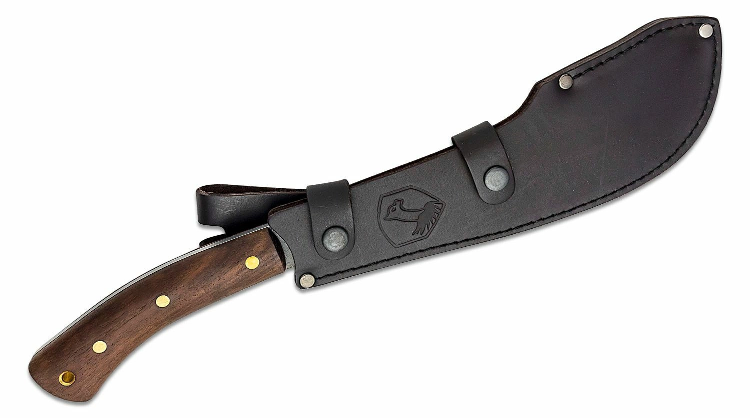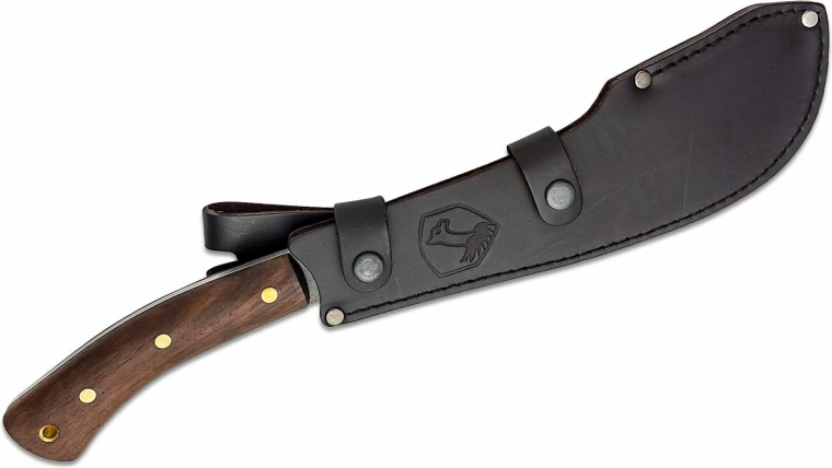 Ergonomická rukojeť z tvrdého dřeva je upevněna mosaznými nýty a díky otvoru pro šňůrku lze mačetu jistit proti vyklouznutí. Součástí je kvalitní kožené pouzdro, které chrání čepel a umožňuje pohodlné nošení při výpravách do přírody.