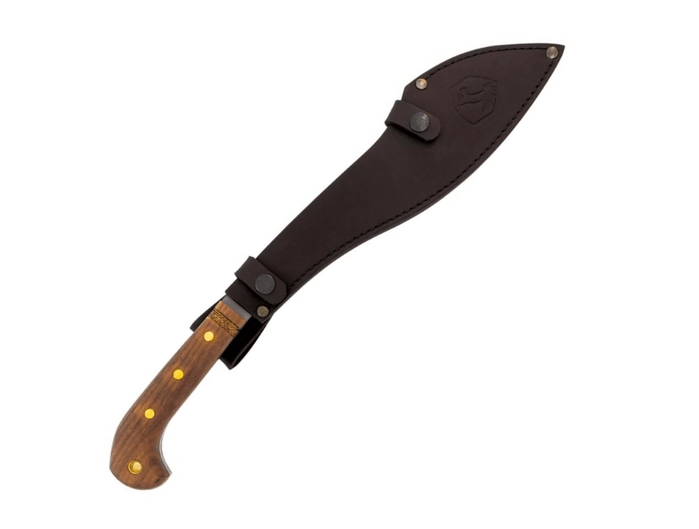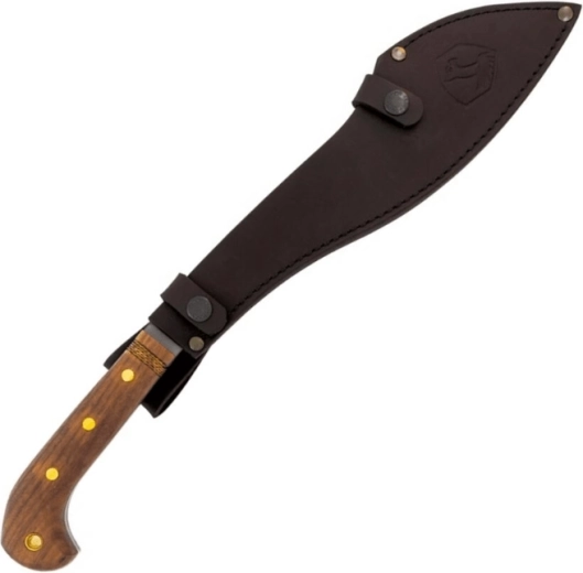 Ergonomická rukojeť z ořechového dřeva s rozšířeným zakončením zajišťuje jistotu úchopu i při razantním sekání. Mačeta je dodávána s kvalitním koženým pouzdrem pro bezpečné nošení a rychlé tasení v terénu.