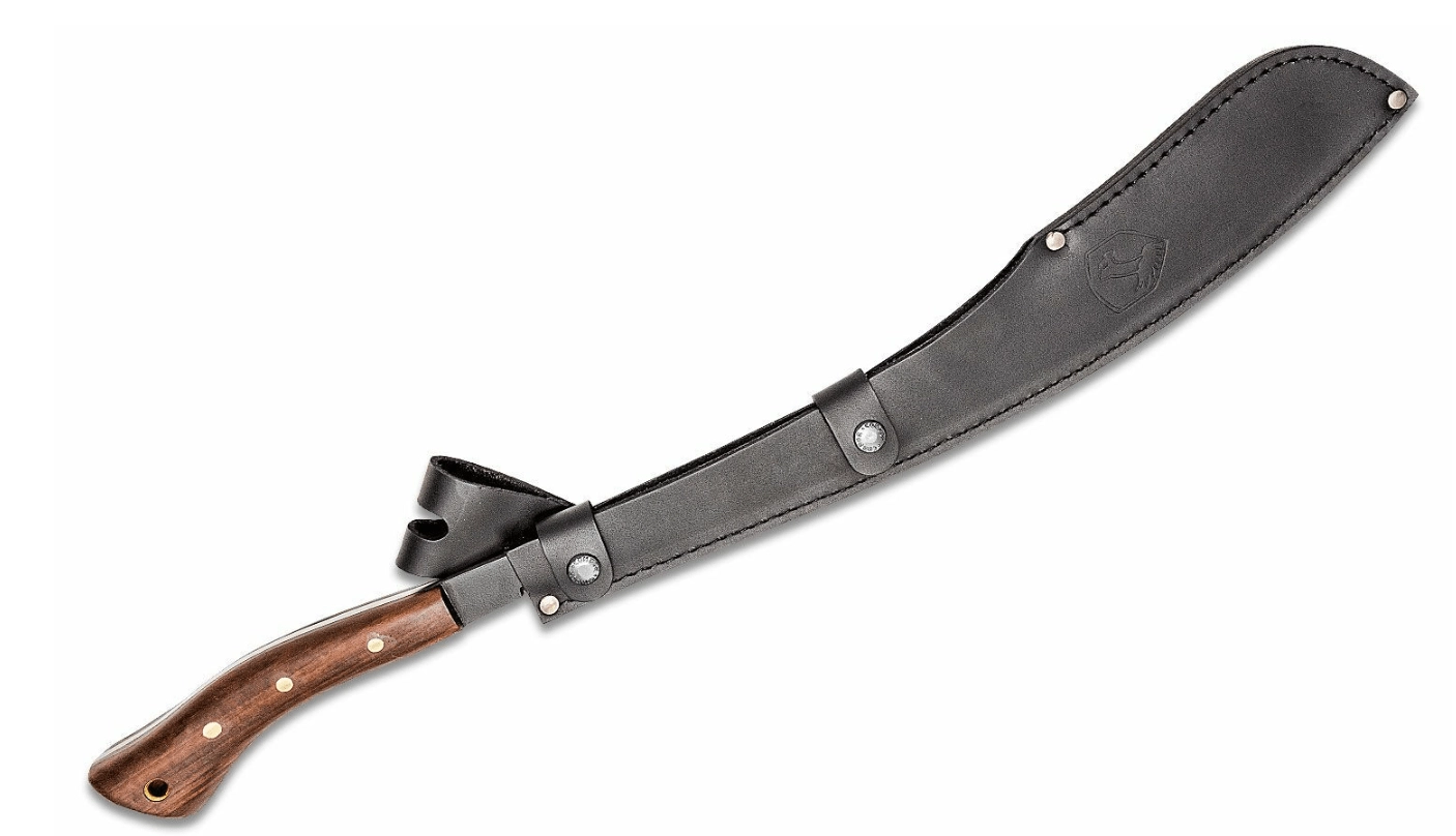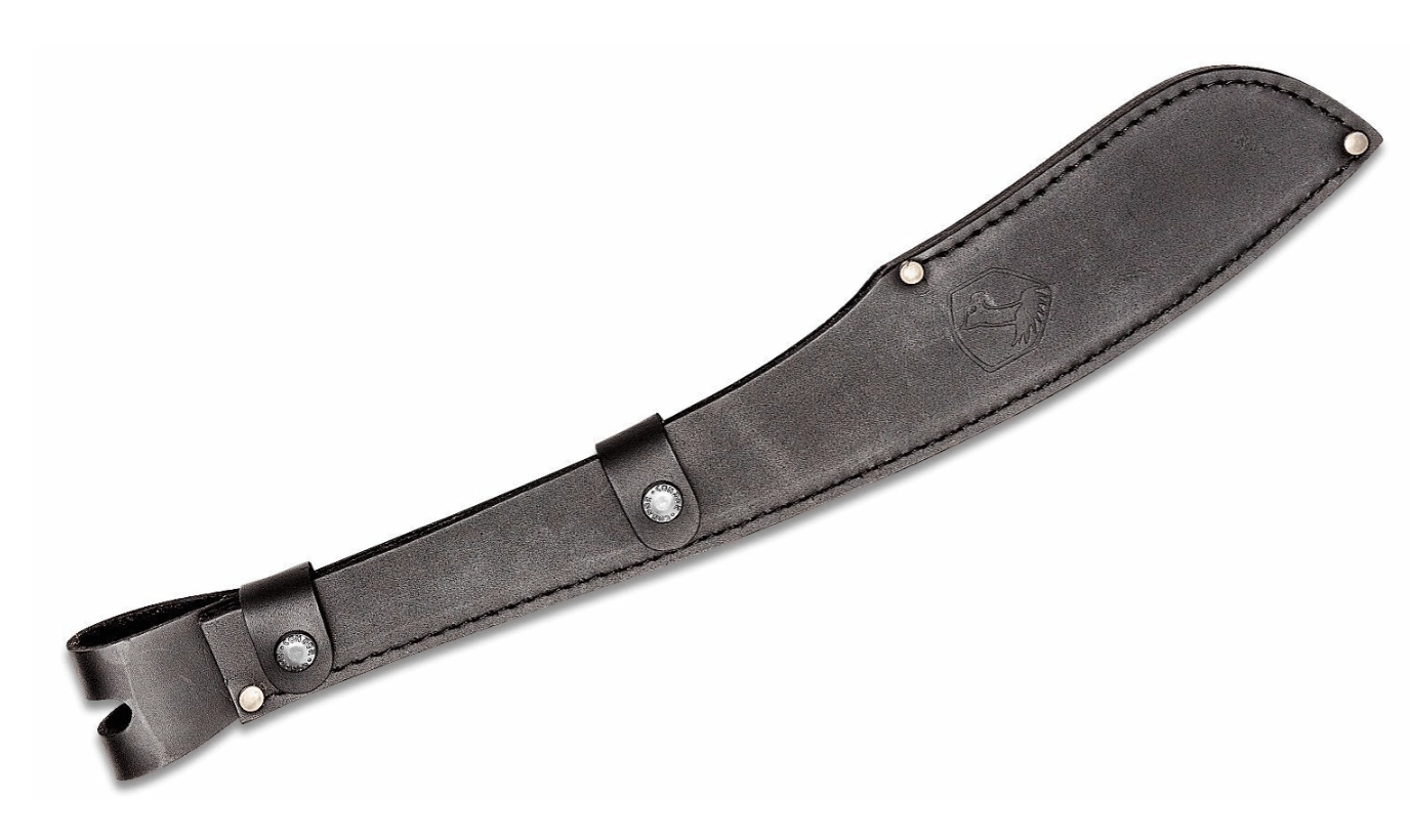 Pevné kožené pouzdro s poutkem na opasek chrání čepel i uživatele a umožní mít mačetu vždy po ruce.