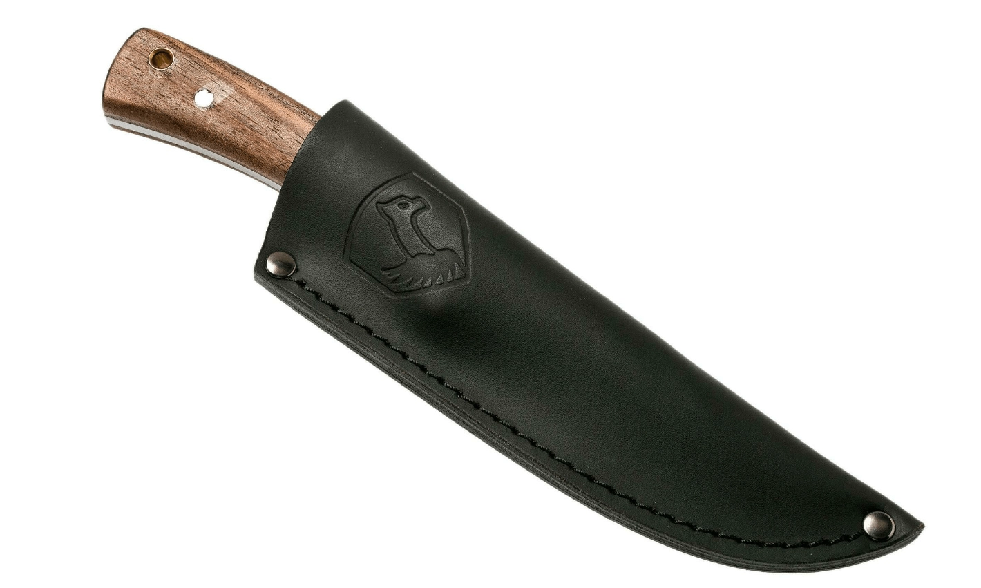 Ergonomická rukojeť z ořechového dřeva skvěle padne do ruky a poskytuje jistotu při batoningu, přípravě potravin i jemnější práci. Na konci rukojeti je praktický otvor pro šňůrku pro lepší zabezpečení při nošení. Součástí balení je kvalitní kožené pouzdro v tmavém provedení pro bezpečné a elegantní uložení nože.