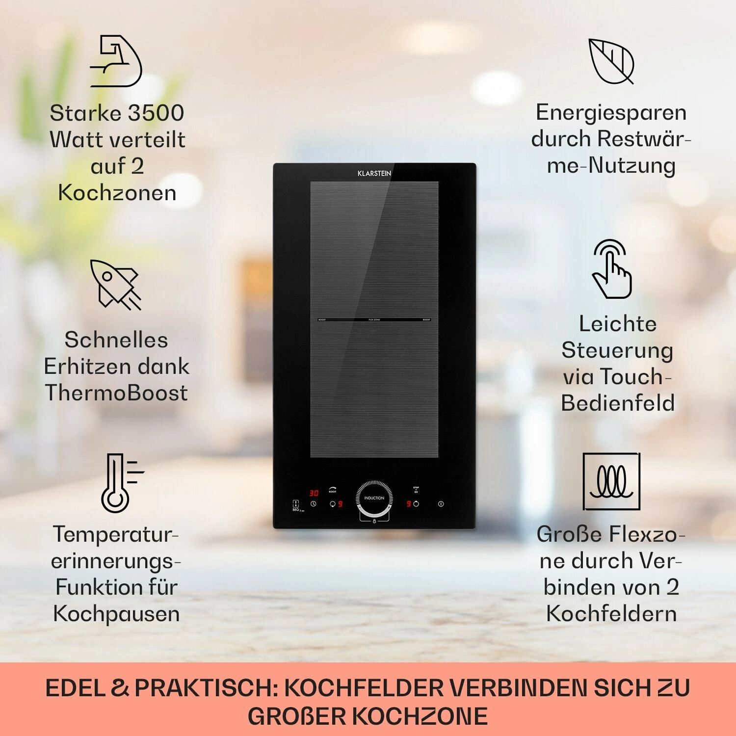 Kompaktní a výkonná indukční deska Klarstein Delicatessa Slim přináší flexibilní vaření, nízkou spotřebu energie a elegantní sklokeramický povrch. Nabízí dvě varné zóny s celkovým výkonem 3500 W, funkci VarioHeating pro spojení do jedné flexi zóny, ThermoBoost pro rychlé ohřátí a praktický dotykový ovládací panel s časovačem až na 99 minut.
