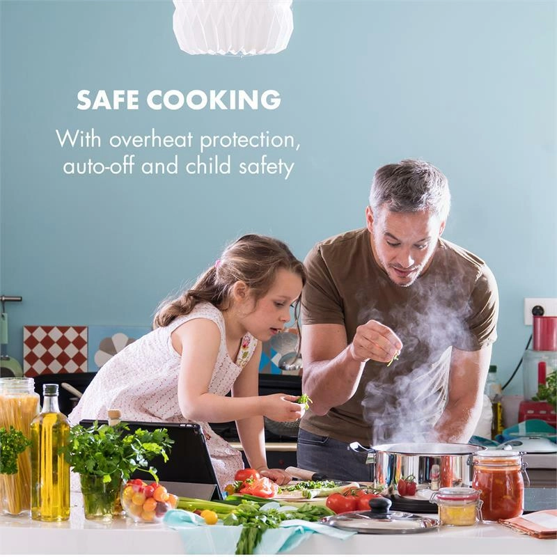 O bezpečnost a úsporu se starají chytré funkce: EcoThermal Control využívá zbytkové teplo, ochrana proti přehřátí s automatickým vypnutím hlídá provoz a dětský zámek brání nechtěným změnám nastavení. Elegantní sklokeramický povrch se snadno čistí a dokonale zapadne do každé kuchyně.