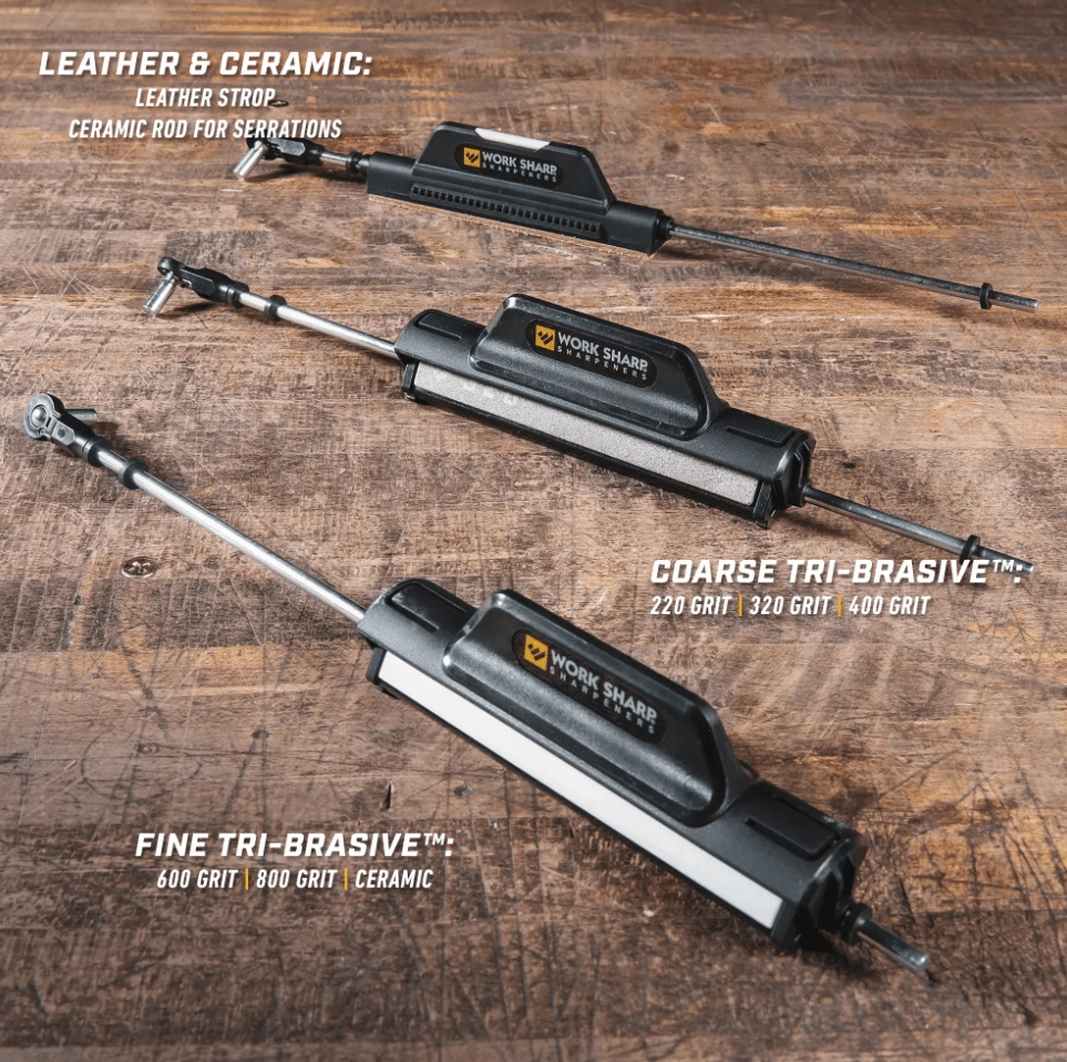 Dvě ergonomické rukojeti Tri-Brasive® nabízejí širokou škálu abraziv pro všechny fáze péče o ostří: od oprav a rychlého ubírání materiálu přes přesné doostření až po finální leštění. Součástí je sada diamantových plátů se zrnitostí 220, 320, 400, 600 a 800, jemná keramická deska a kožený řemínek pro zrcadlový finiš. Pro zoubkované nože poslouží keramická tyč, se kterou jednoduše obnovíte ostrost jednotlivých zubů.