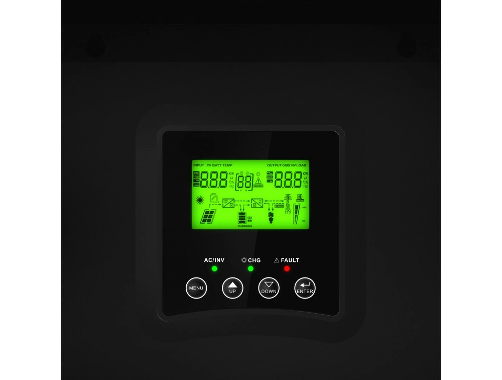 Díky MPPT technologii dokáže maximálně využít výkon solárních panelů a inteligentně dobíjet baterie. Přehledný LCD displej zobrazuje klíčové parametry provozu a umožňuje přizpůsobit nastavení vašim potřebám.