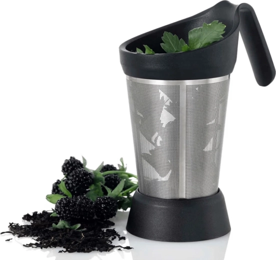 Chytrý stojánek 2v1 funguje během louhování jako víčko, které udrží teplo, a po vyjmutí sítka jako odkapávač, takže pracovní deska zůstane čistá. Díky praktické rukojeti lze sítko zavěsit na okraj hrnku nebo čajníku.