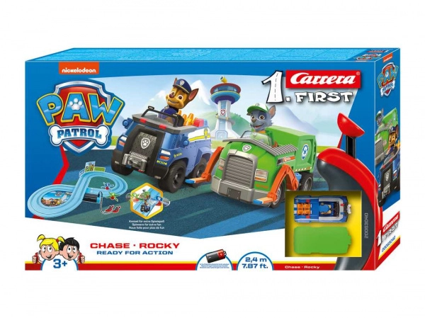 Autodráha CARRERA FIRST Tlapková patrola 2,4 m pro děti od 3 let. Dvě auta, točící vrtule, ovladače, kvalitní zpracování. Bateriový provoz 4× C.