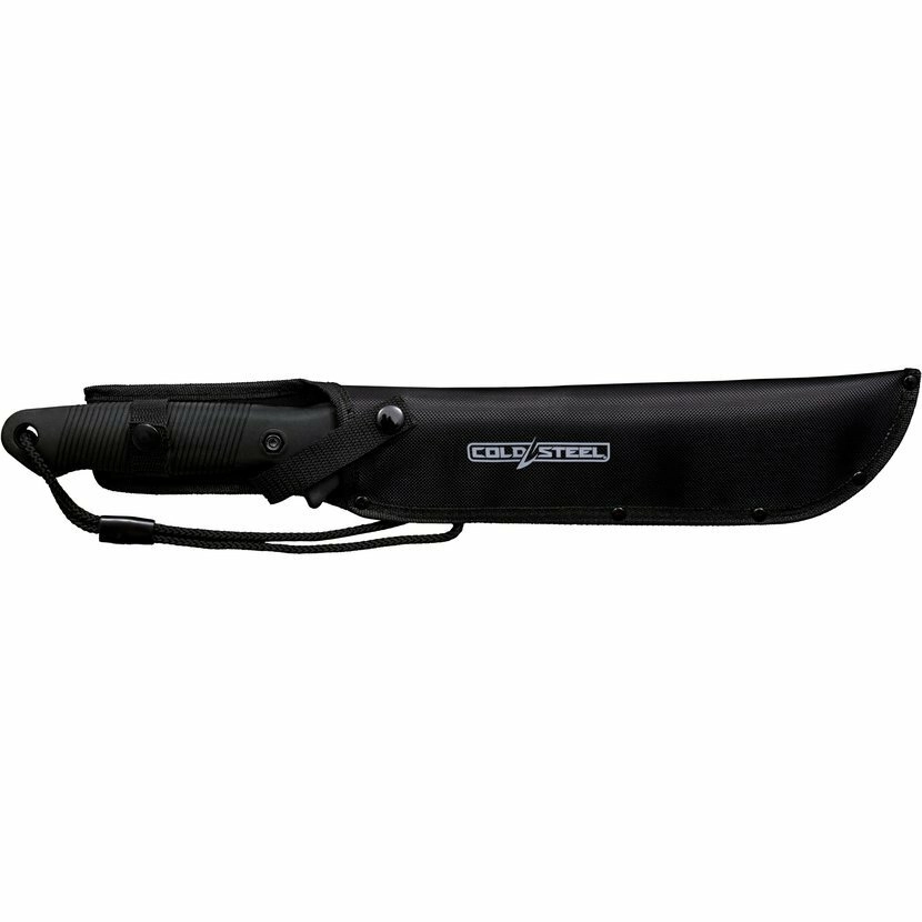 Na hřbetu najdete praktické pilové zuby, které oceníte při řezání větví a drobného dřeva. Ergonomická gumová rukojeť s texturovanými šikmými pruhy zajišťuje jistý úchop i v mokru; na konci je otvor pro provlečení šňůrky. Mačeta se dodává s pevným nylonovým pouzdrem na opasek, takže ji můžete mít vždy po ruce.