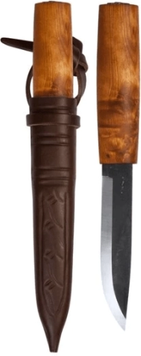 Pevná čepel z laminované nerezové oceli s trojitým složením a tradičním skandinávským výbrusem zajišťuje výborné držení ostří, snadné broušení a čisté řezy při práci se dřevem i potravinami. Barelovitá rukojeť z kořenové břízy je zúžená pro pohodlný a jistý úchop, přirozeně padne do ruky a poskytuje vynikající kontrolu bez záštity.