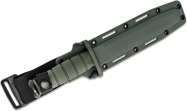 Robustní taktický nůž KA-BAR pro náročné použití v terénu i outdoorové aktivity. Nabízí pevnou čepel 1095 Cro-Van s černou protikorozní úpravou, neklouzavou rukojeť Kraton v zelené barvě a plastové pouzdro pro bezpečné nošení.