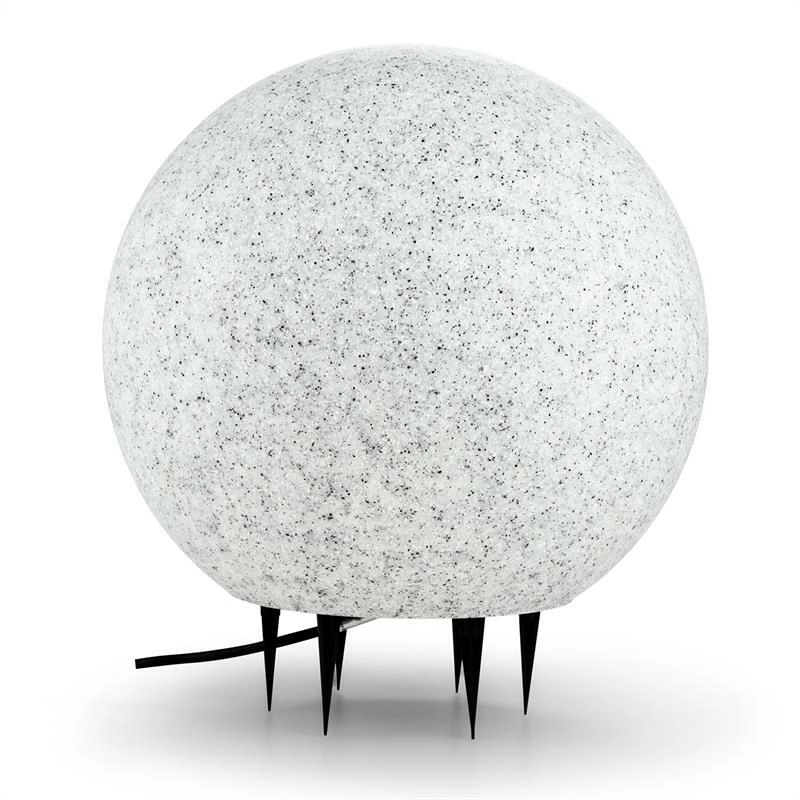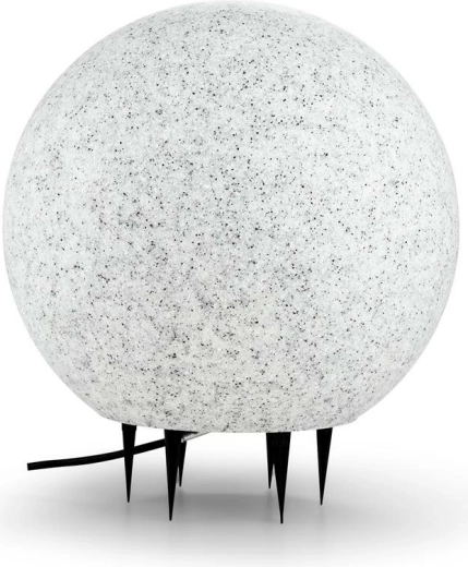 Dekorativní kulová lampa LIGHTCRAFT Shinestone XL s průměrem 50 cm přináší do zahrady, na terasu či k příjezdové cestě atmosférické osvětlení. Přes den zaujme optikou přírodního kamene, v noci vytvoří působivé světelné scenérie. Díky patici E27 je kompatibilní s běžnými i barevnými žárovkami do 40 W. Odolné provedení IP65 zvládne déšť i vítr a díky zemním kolíkům ji snadno a bezpečně umístíte do trávníku či záhonu.