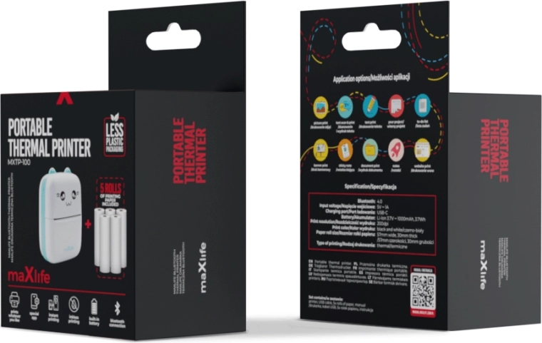 Užijte si svobodu tisku kdykoli a kdekoli. Přenosná tiskárna Maxlife MXTP-100 Blue pracuje na bázi termální technologie, takže nepotřebuje inkoust ani toner. Stačí vložit termopapír a začít tvořit: od rychlých poznámek, nálepek a štítků až po jednoduché černobílé fotografie a kresby.