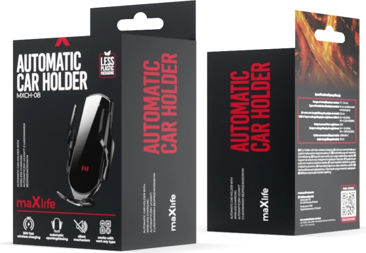 Automatický držák do auta MAXLIFE je navržen pro pohodlné a bezpečné používání během jízdy. Integrovaná cívka pro indukční (Qi) nabíjení dodává výkon až 15 W, takže kompatibilní telefony nabijete rychle a bez kabelů. Držák se upíná do ventilační mřížky, přičemž tichý automatický mechanismus ramen zajistí pevné sevření telefonu jednou rukou.